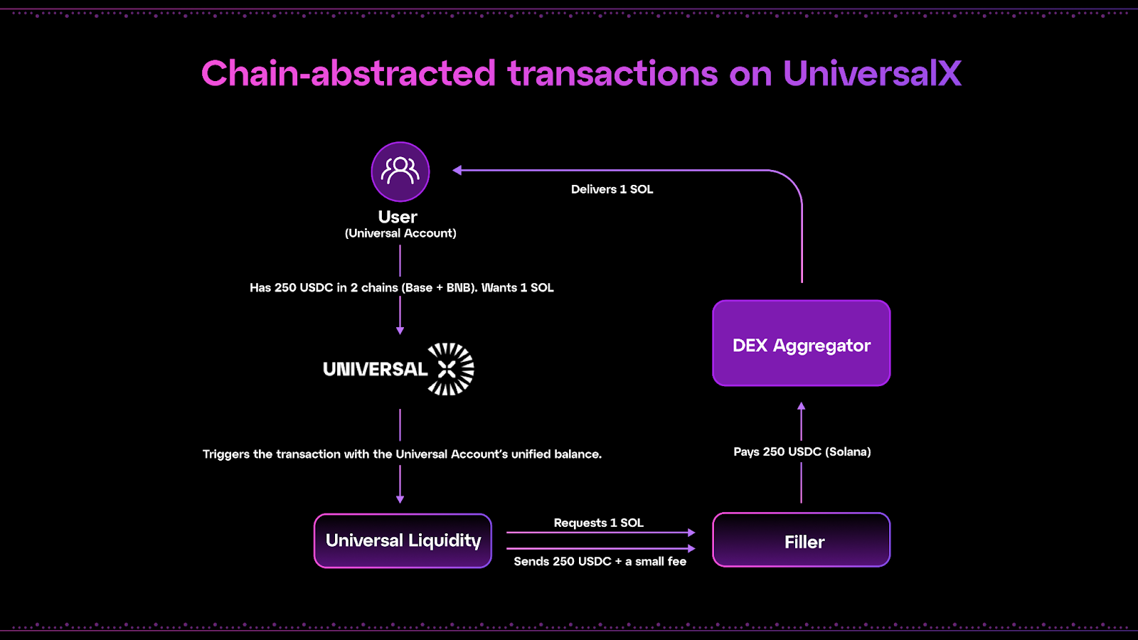 UniversalX는 체인 추상화 속성 또는 내장된 거래 기능을 위해 사용할 수 있습니다. 사용자는 다음을 수행할 수 있습니다. 다양한 지원되는 EVM 체인 및 Solana에서 토큰을 입금합니다. 토큰을 사용하여 이러한 모든 체인에서 통합된 잔액으로 거래합니다. 지연 시간 없이 모든 토큰의 가격, 온체인 및 정성적 데이터를 확인합니다. 모든 체인에서 자산을 직접 보내고 받습니다. 모든 체인에서 모든 토큰으로 가스 비용을 지불합니다. 직불 카드 또는 신용 카드, Apple Pay 및 기타 통합을 통해 현금을 사용하여 수천 개의 토큰, 심지어 미메코인을 구매합니다. 초고속 속도와 확인 시간으로 거래합니다. 완전한 MEV 보호를 누리세요. 이 모든 것이 브리징 없이 가능합니다. 실제로 UniversalX는 완전한 온체인 CEX와 동등한 경험을 제공합니다.