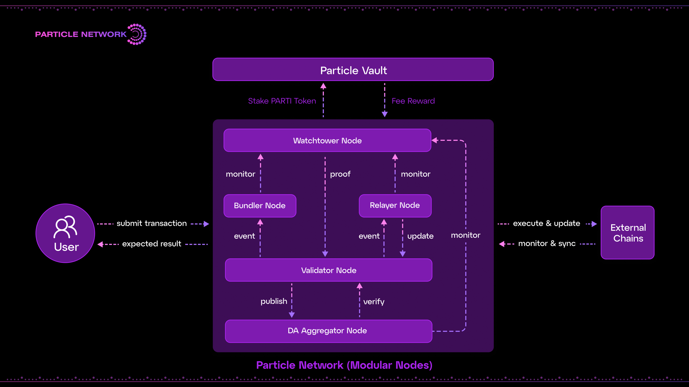사용자는 노드를 실행하여 Particle Chain의 분산화와 보안을 지원할 수 있습니다. "모듈러 노드"는 Particle Chain에서 각각 다른 역할을 하는 다양한 유형의 노드를 통틀어 부르는 용어입니다.
